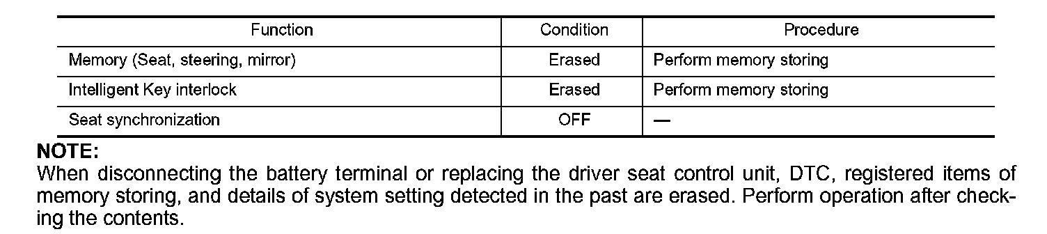 Each function is reset to the following condition when the driver seat control unit is replaced.