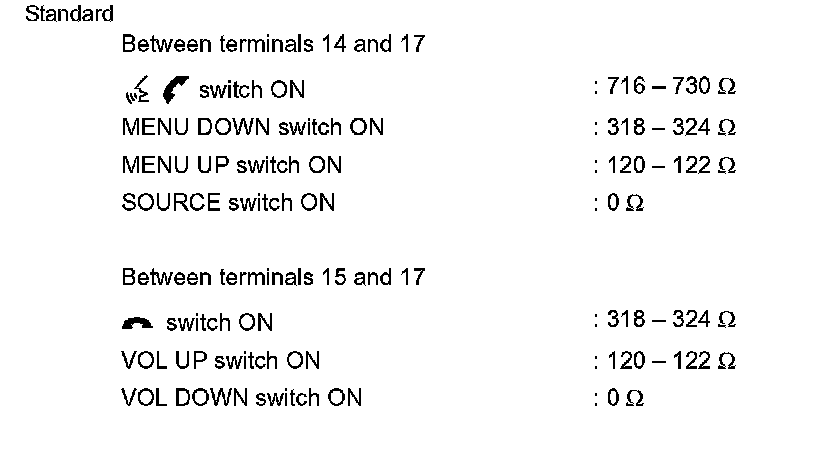 Measure the resistance between the steering switch connector terminals 14 to 17 and 15 to 17.