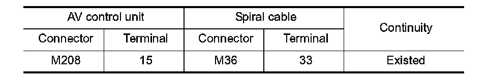 2. Check continuity between AV control unit harness connector and spiral cable harness connector.