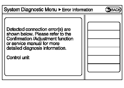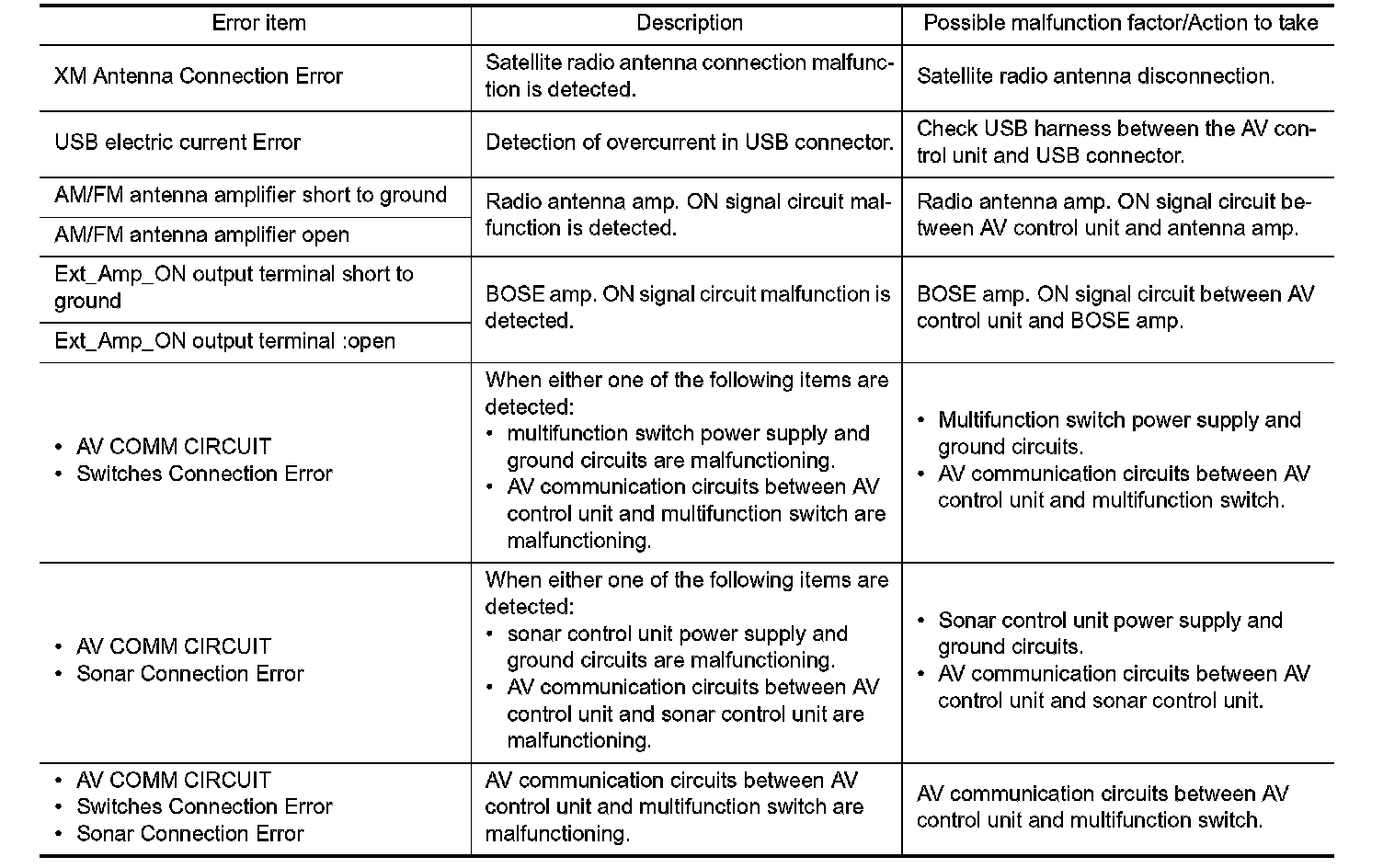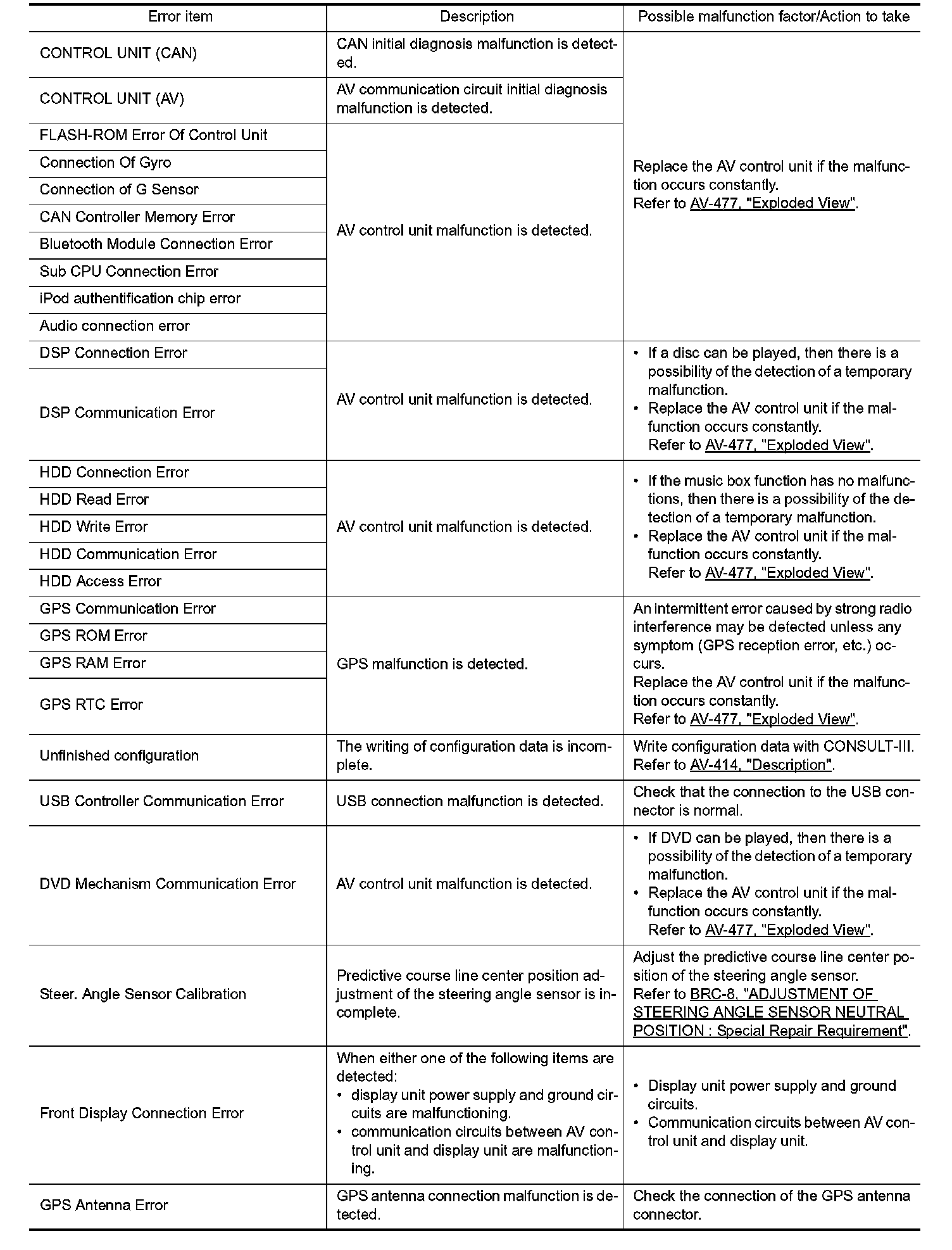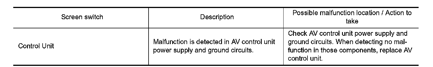 - Replace AV control unit if "Self-Diagnosis did not run because of a control unit malfunction" is indicated. The symptom is AV control unit internal error. With Navigation.