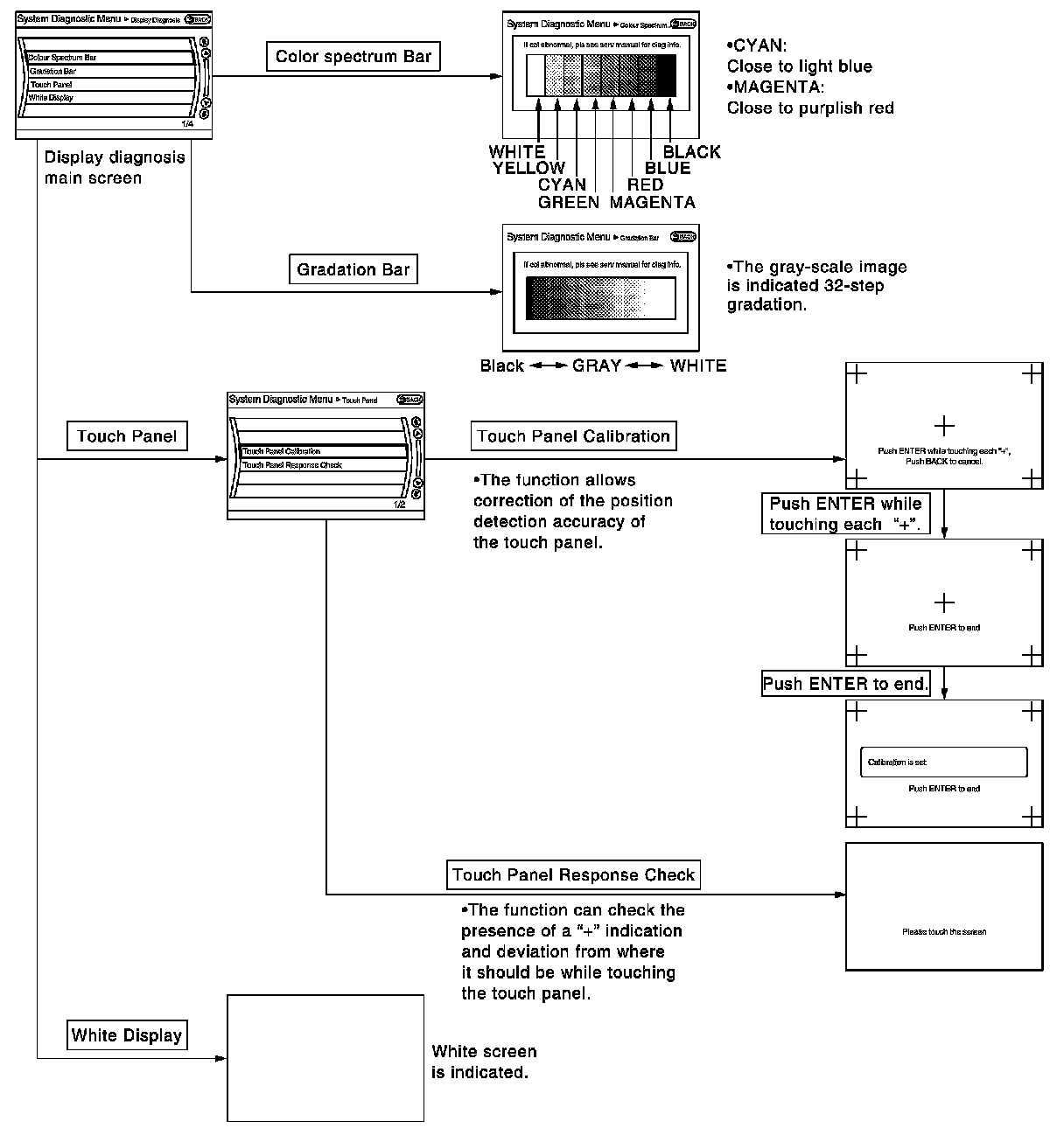- The bar graph visible on the center of the self-diagnosis subdivision screen indicates progress of the trouble diagnosis.