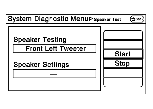 Select "SPEAKER DIAGNOSIS" to display the Speaker Diagnosis screen. Press "Start" to generate a test tone in a speaker. Press "Start" to generate a test tone in the next speaker. Press "Stop" to stop the test tones.