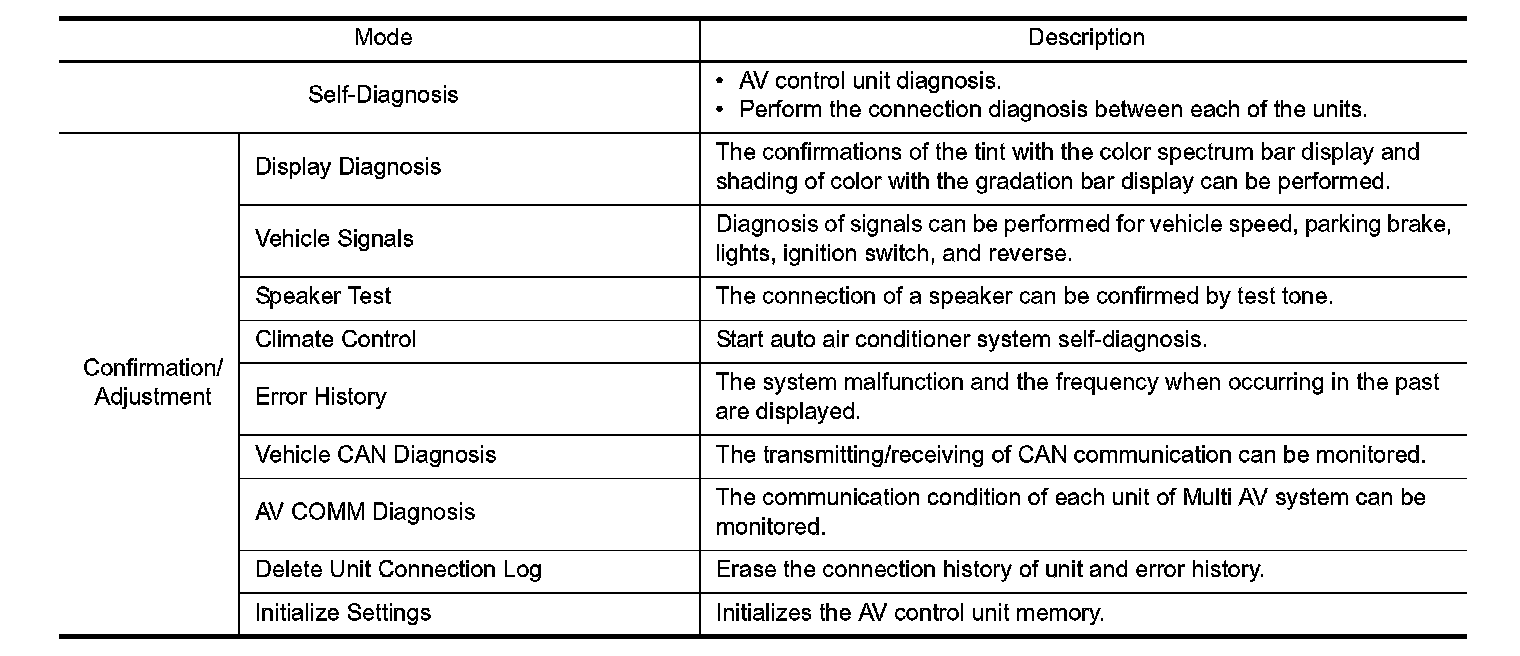 - The self-diagnosis mode allows the technician to diagnose the connection in the communication line between AV control unit and each unit and the internal operation of the AV control unit.