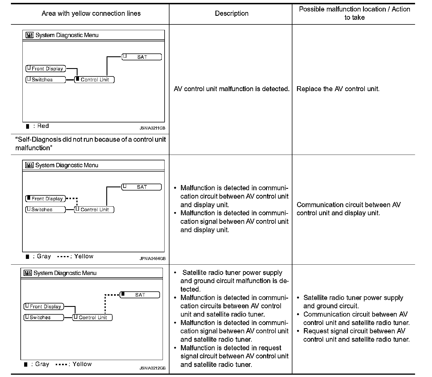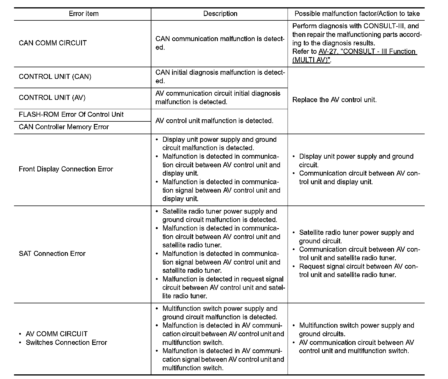^ Replace AV control unit if "Self-Diagnosis did not run because of a control unit malfunction" is indicated. The symptom is AV control unit internal error. Refer to AV-89, "Exploded View".