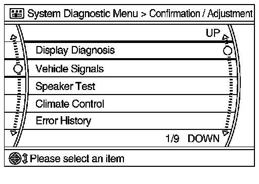 1. Start the diagnosis function and select "Confirmation/Adjustment". The confirmation/adjustment mode indicates where each item can be checked or adjusted.