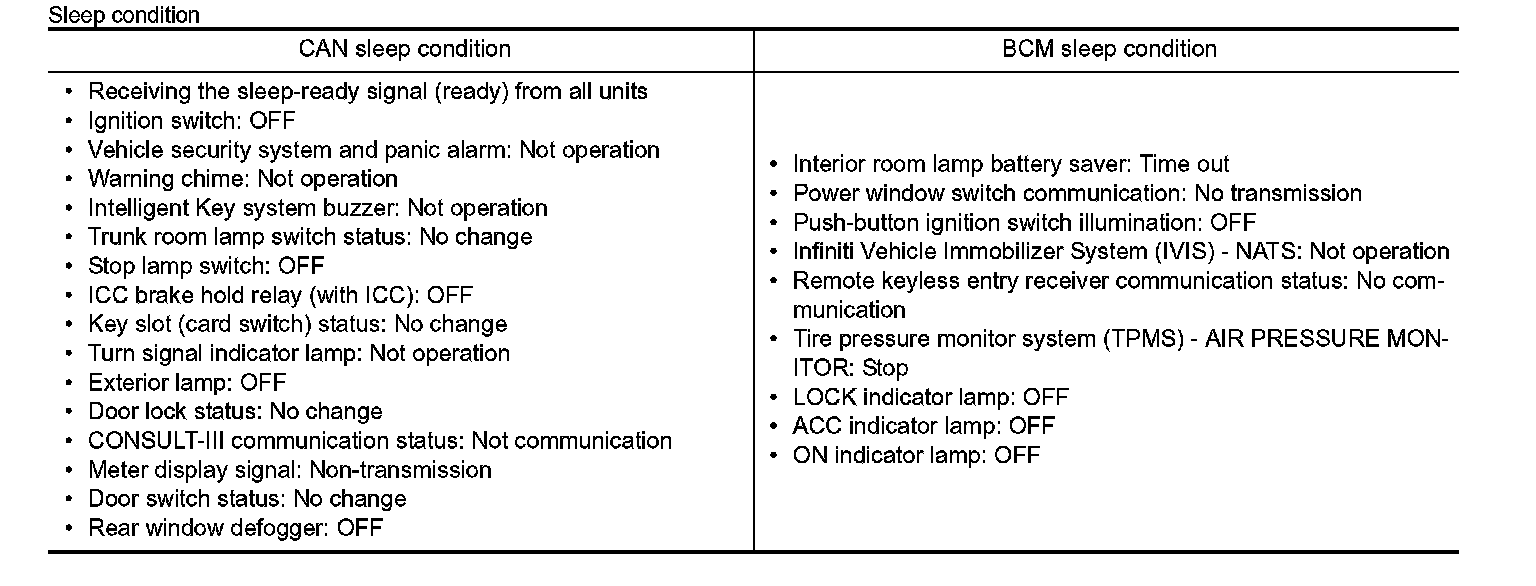 - BCM transmits the sleep wake up signal (sleep) to each unit when all of the CAN sleep conditions are fulfilled.