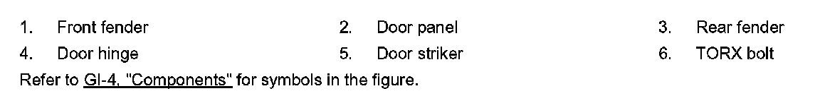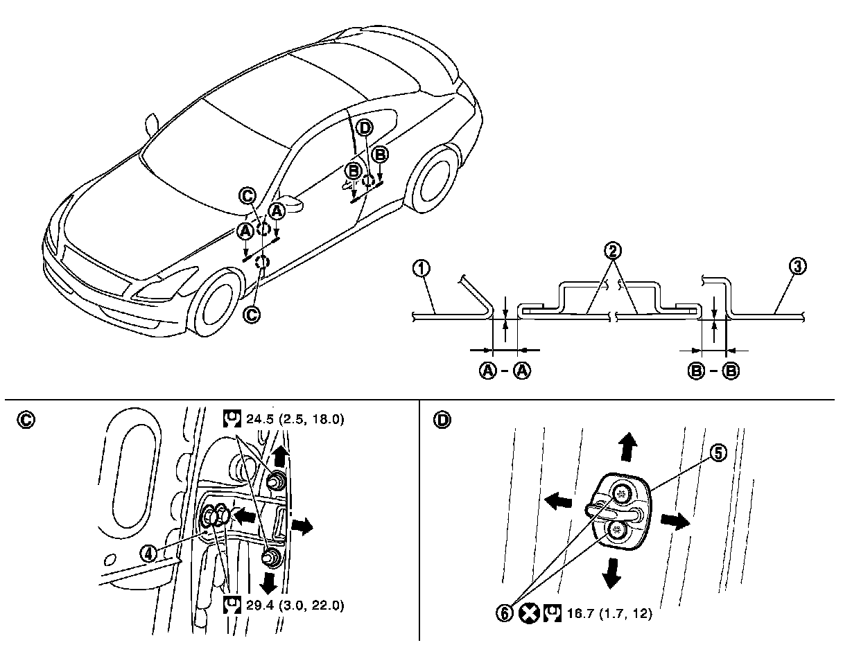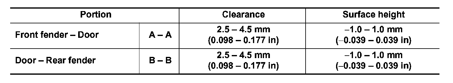 1. Check the clearance and surface height and surface mismatch between the door and each part visually and by touching. (Fitting standard dimension in the table below should be satisfied.)