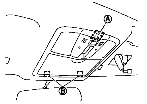 11. Pull the roof console assembly toward vehicle lower, and disengage the metal clips (B) and the dual-lock fastener (A).