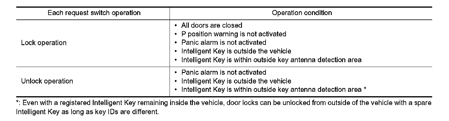 When all doors are locked, ignition switch is in the OFF position and key switch is OFF (Intelligent Key is not inserted in key slot), doors are unlocked with door request switch