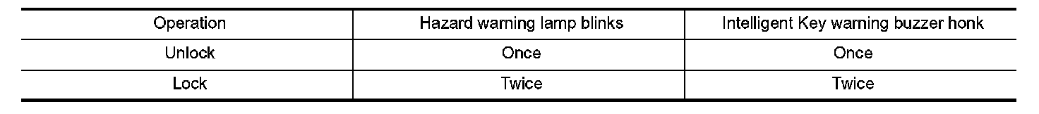 During lock, unlock, operation by each request switch, the hazard warning lamps and Intelligent Key warning buzzer blinks or honk as a reminder.