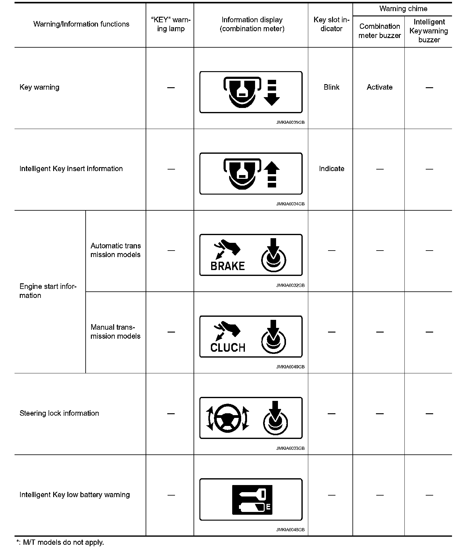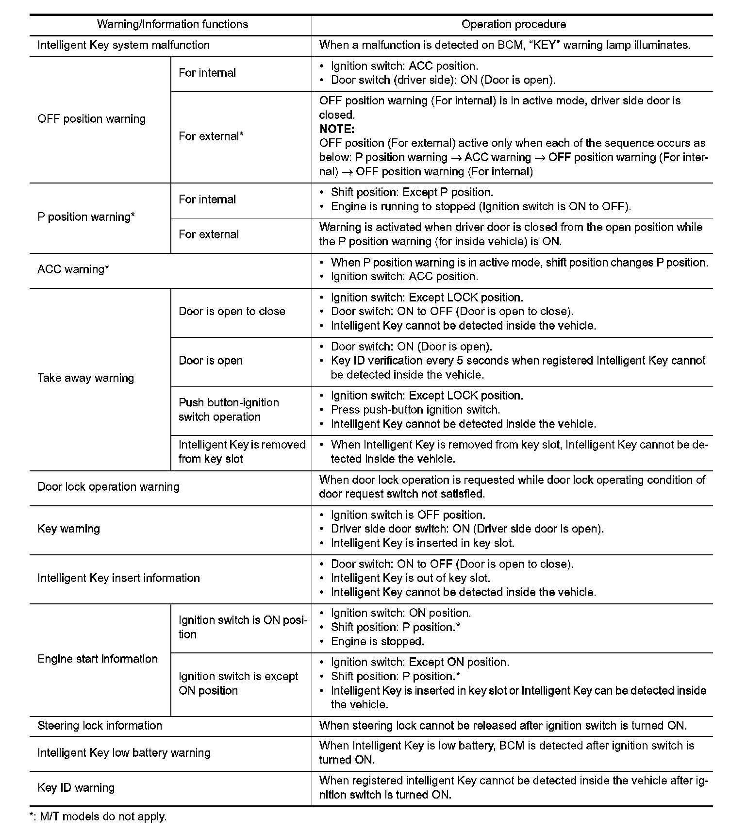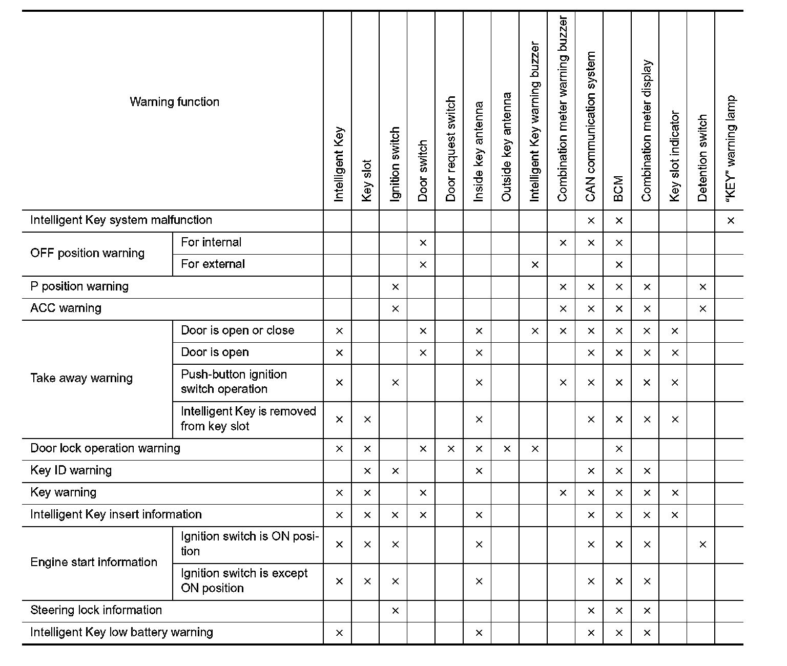 The warning function are as per the following items and are given to the user as warning information and warnings using combinations of Intelligent Key warning buzzer, KEY warning lamp, key slot indicator and information display in combination meter.