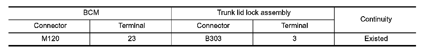 2. Check continuity between BCM harness connector and trunk lid lock assembly harness connector.