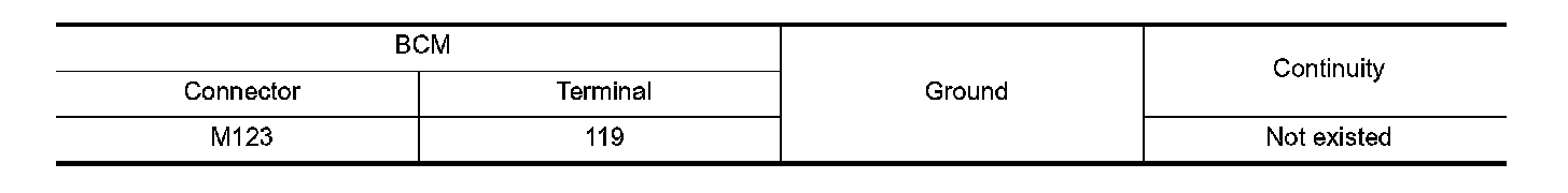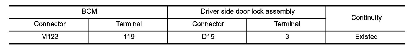 2. Check continuity between BCM harness connector and driver side door lock assembly harness connector.