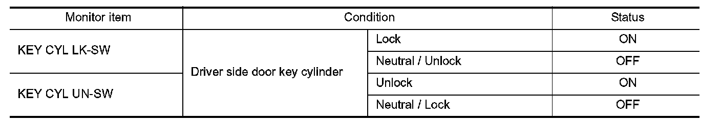 Check ("KEY CYL LK-SW", "KEY CYL UN-SW") in "Data Monitor" mode using CONSULT-III.