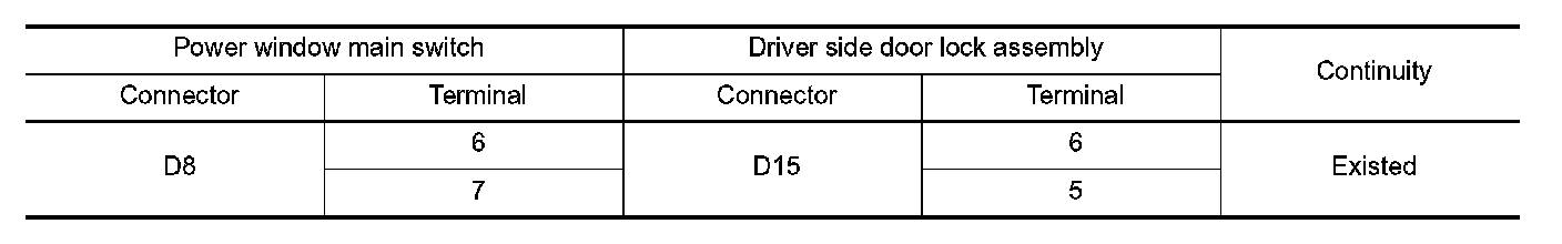 2. Check continuity between power window main switch harness connector and driver side door lock assembly harness connector.