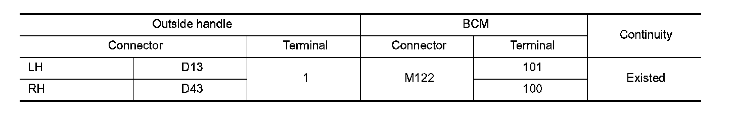 2. Check continuity between malfunctioning outside handle harness connector and BCM harness connector.