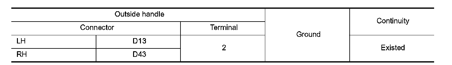 3. Check continuity between malfunctioning outside handle harness connector and ground.