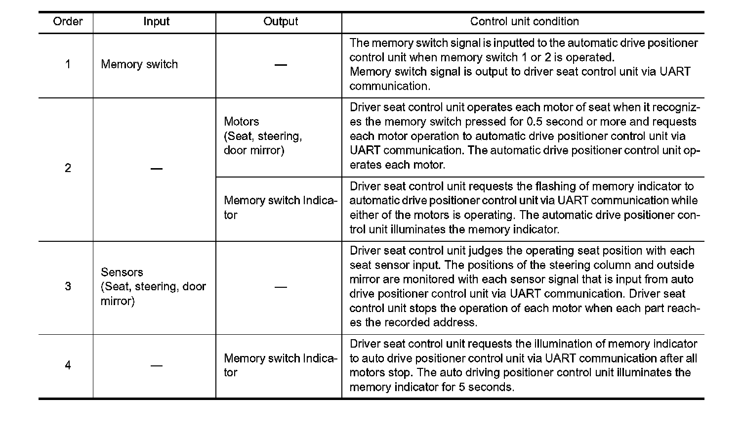 The driver seat control unit can store the optimum driving positions (seat, steering column and door mirror position) for 2 people. If the front seat position is changed, one-touch (pressing desired memory switch for more than 0.5 second) operation allows changing to the other driving position.