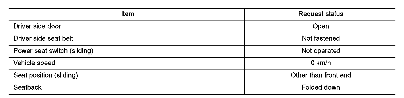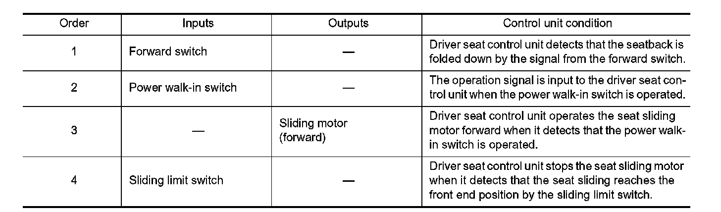 Slides the driver seat to the front end position (sliding limit switch: ON) by operating the power walk-in switch when the seatback is folded down.