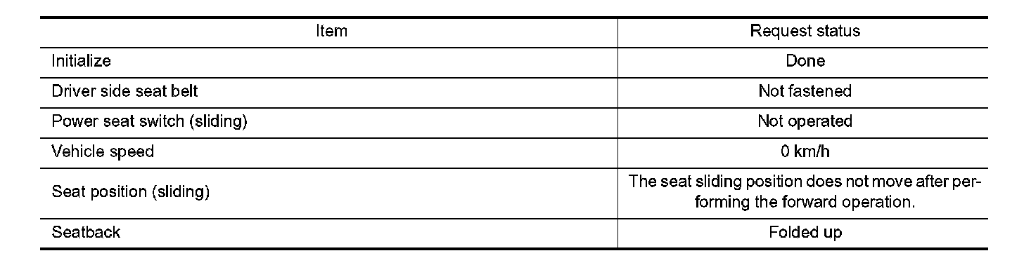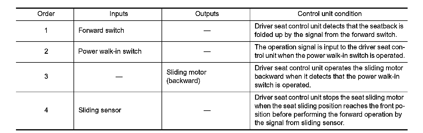 The seatback is folded up after performing the forward operation of power walk-in function. Slide the driver seat to the backward position before performing the forward operation again by operating the power walk-in switch.