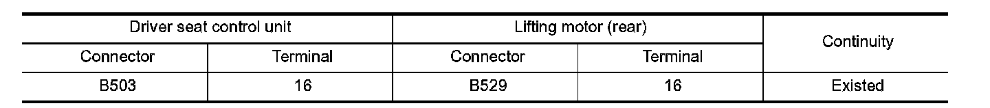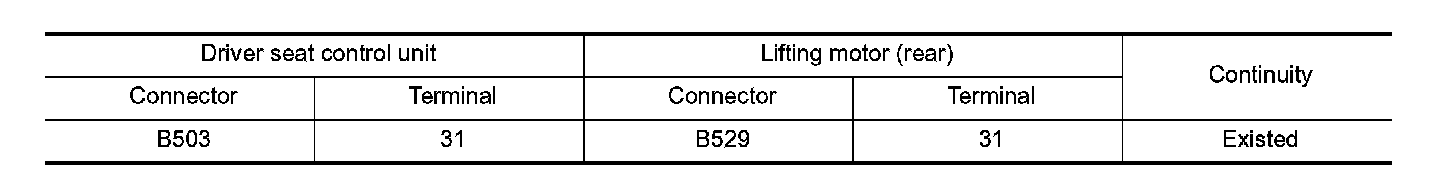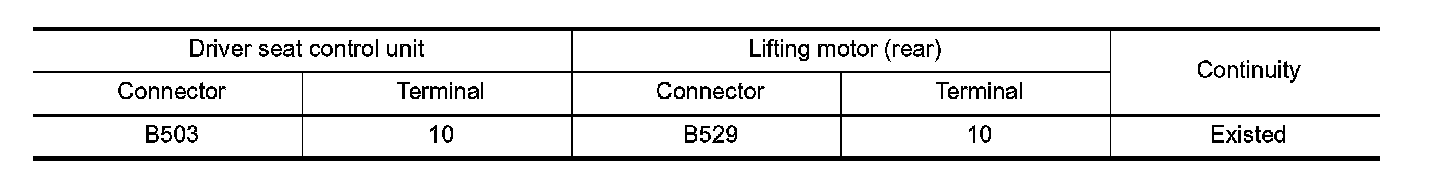 3. Check the continuity between driver seat control unit harness connector and lifting motor (rear) harness connector.