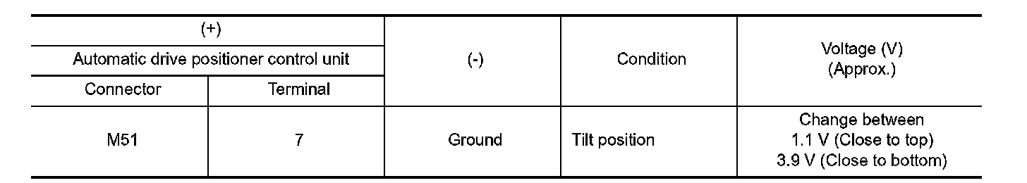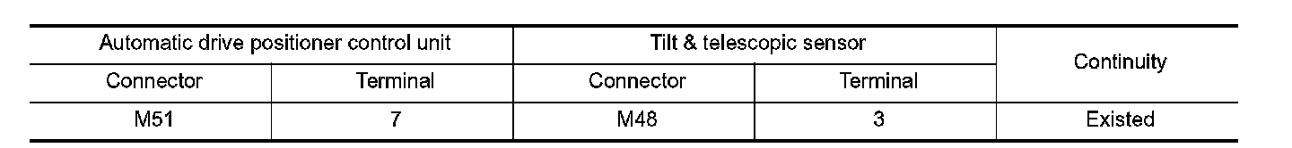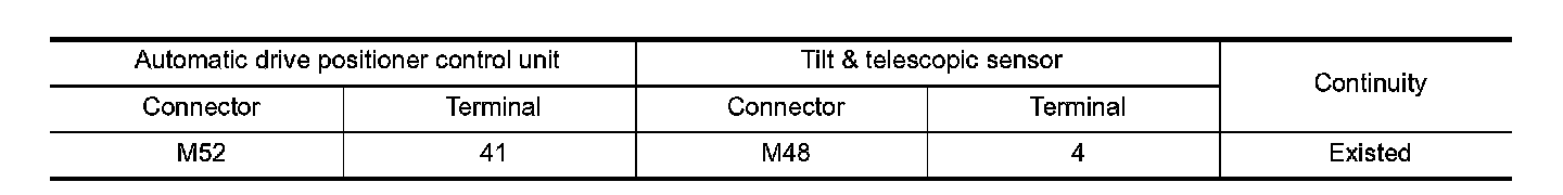3. Check continuity between automatic drive positioner control unit harness connector and tilt & telescopic sensor harness connector.