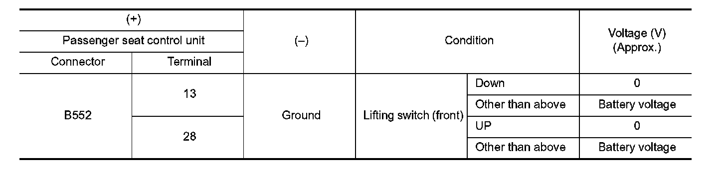 - The operation signal is input to the passenger seat control unit when the lifting switch (front) is operated.