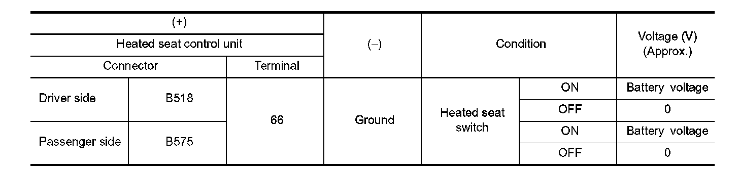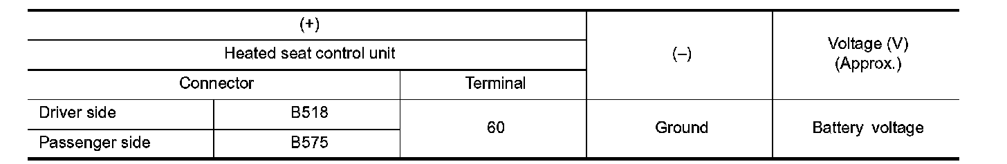 Check voltage between heated seat control unit harness connector and ground.