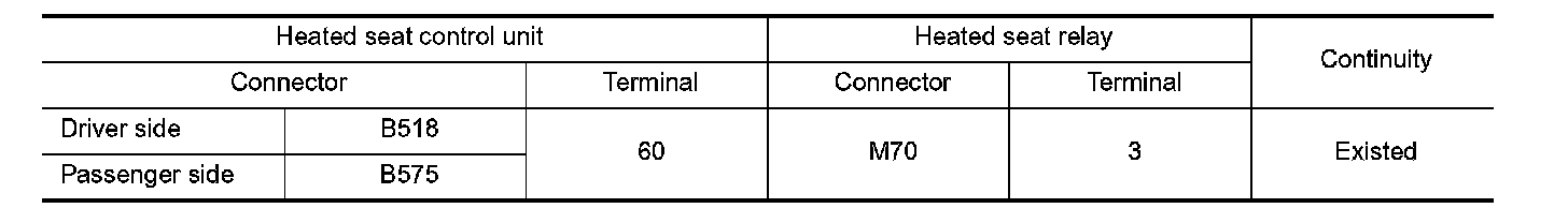 3. Check continuity between heated seat control unit harness connector and heated seat relay terminal connector.