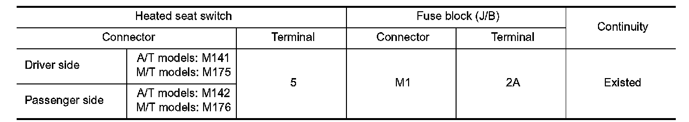 3. Check continuity between heated seat switch harness connector and fuse block (J/B) harness connector.