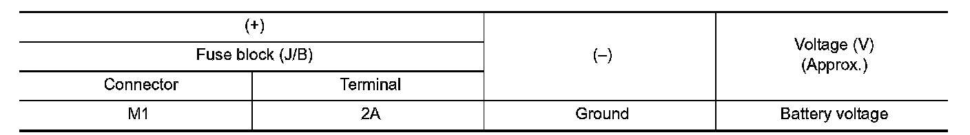 2. Check voltage between fuse block (J/B) connector (fuse block side) and ground.