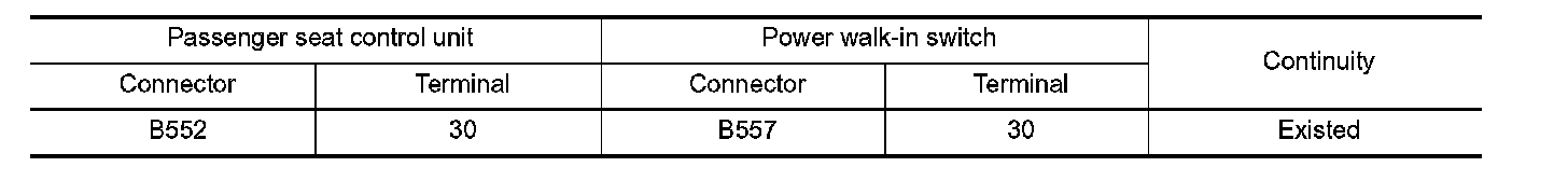 2. Check continuity between passenger seat control unit harness connector and power walk-in switch harness connector.