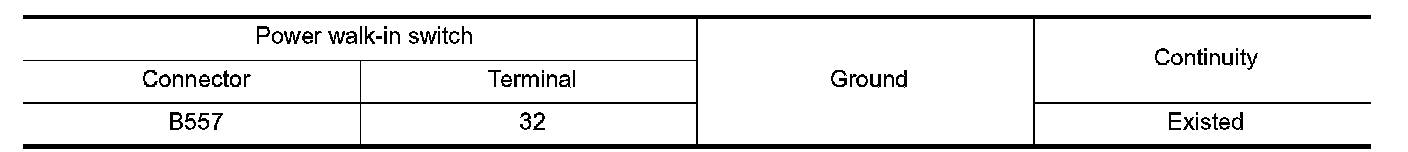 Check continuity between power walk-in switch harness connector and ground.