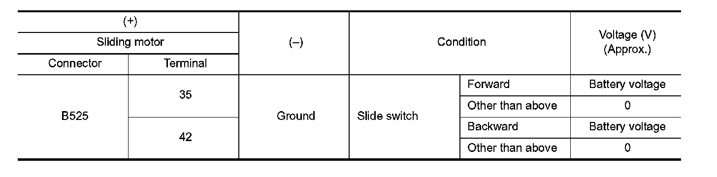 2. Check continuity between sliding motor harness connector and driver seat control unit harness connector.