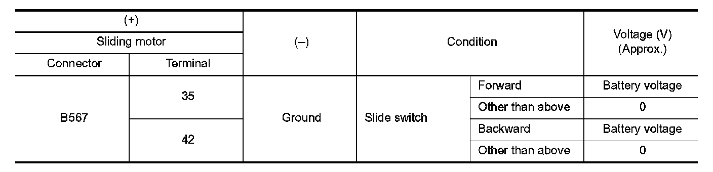 2. Check continuity between sliding motor harness connector and passenger seat control unit harness connector.