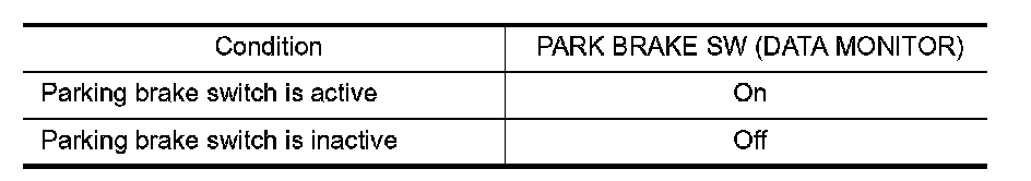 The parking brake switch converts the status of the parking brake lever (M/T models) or the parking brake pedal (A/T models) to an electric signal and transmits it to the ABS actuator and electric unit (control unit).