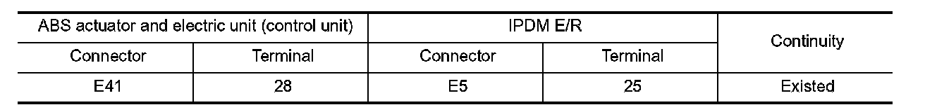 4. Check continuity between ABS actuator and electric unit (control unit) harness connector and IPDM E/R harness connector.