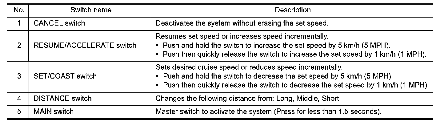 If the system is cancelled by conditions 1-6 below, the system will resume control at the last set cruising speed by pushing up the RESUME/ACCELERATE switch.