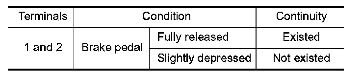 2. Check the continuity between ASCD brake switch terminals under the following conditions.