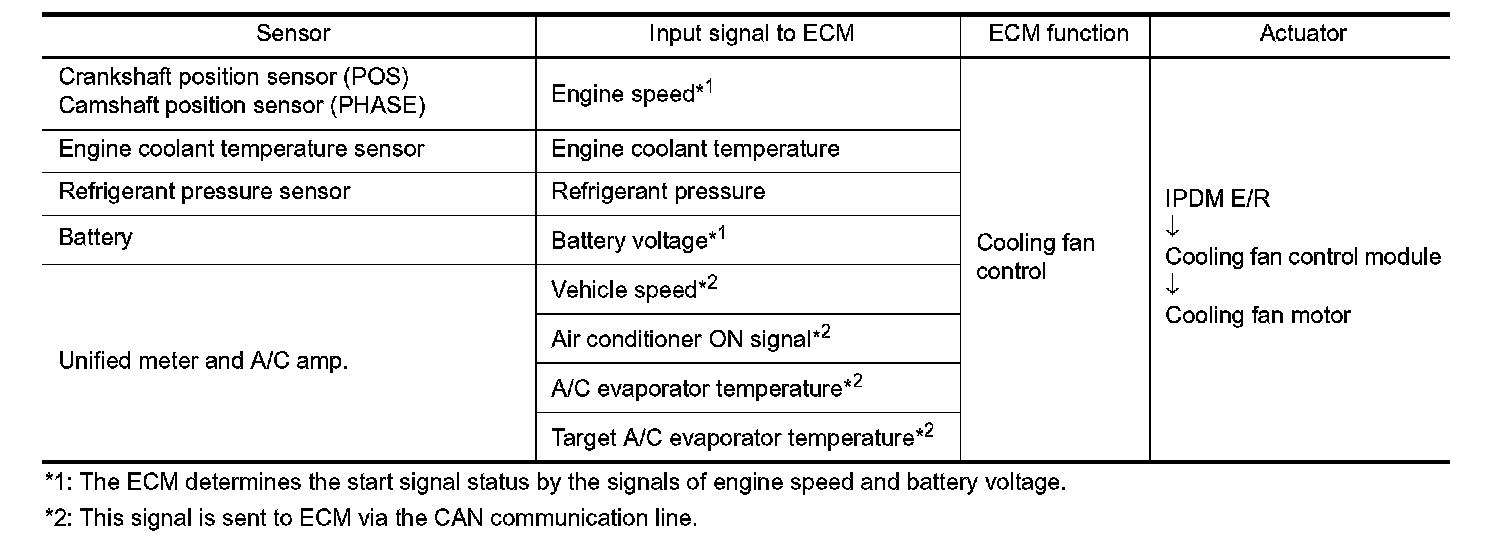 Cooling fan control signal is sent to IPDM E/R from ECM by CAN communication line. Then, IPDM E/R sends