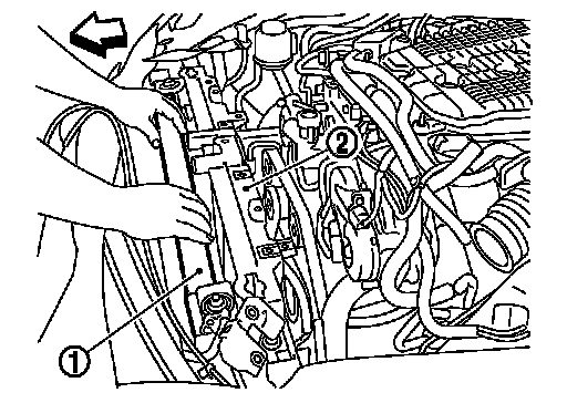 b. Remove radiator & condenser assembly (1) from front of radiator core support (2).