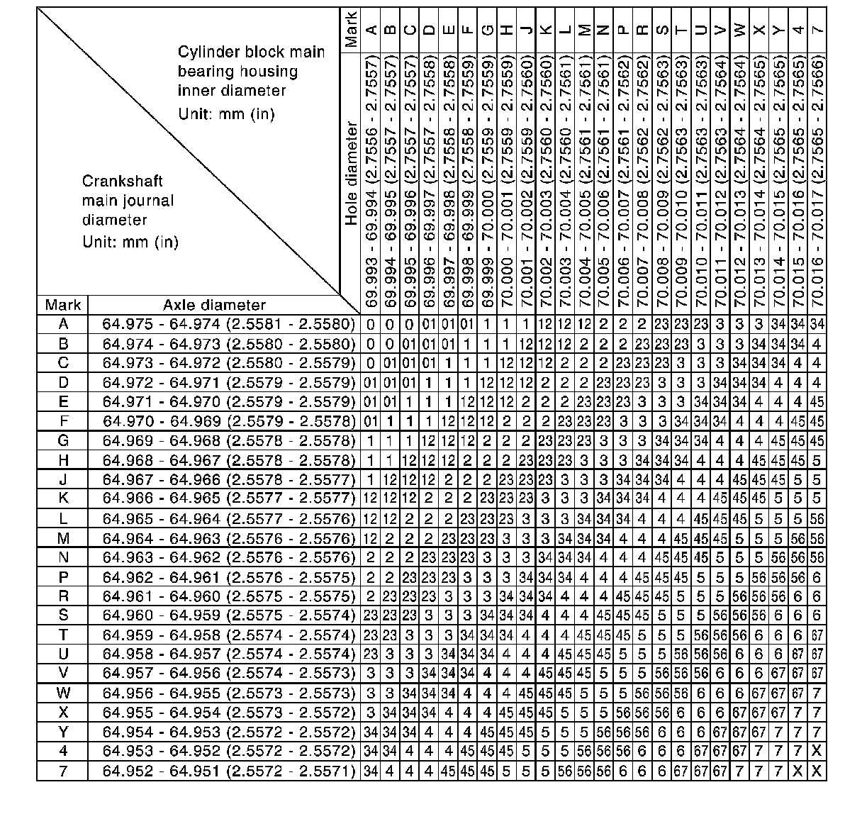 2. "MAIN BEARING SELECTION TABLE" columns correspond to journal diameter grade on front side of crankshaft.