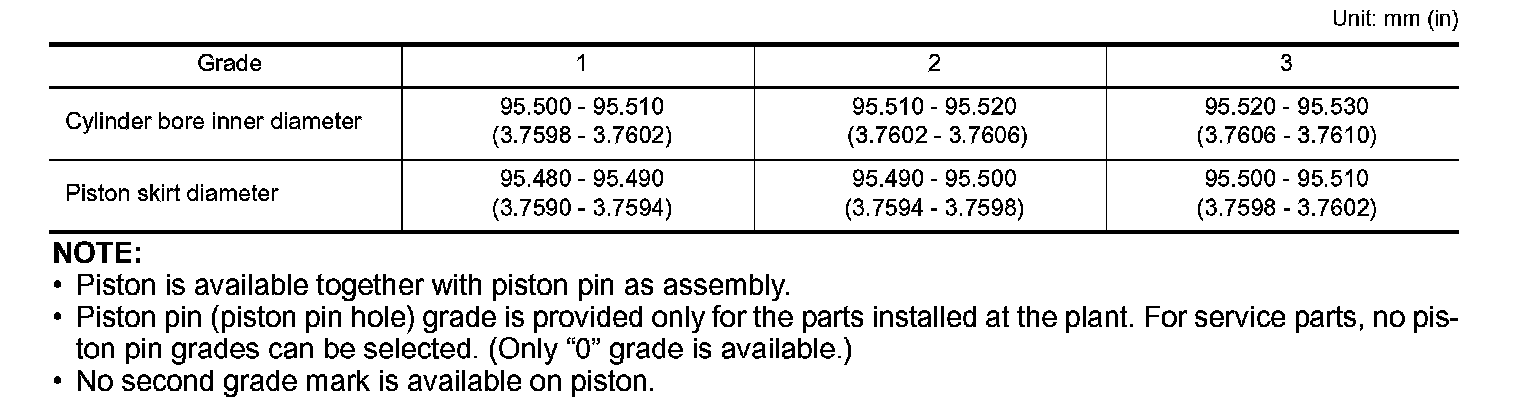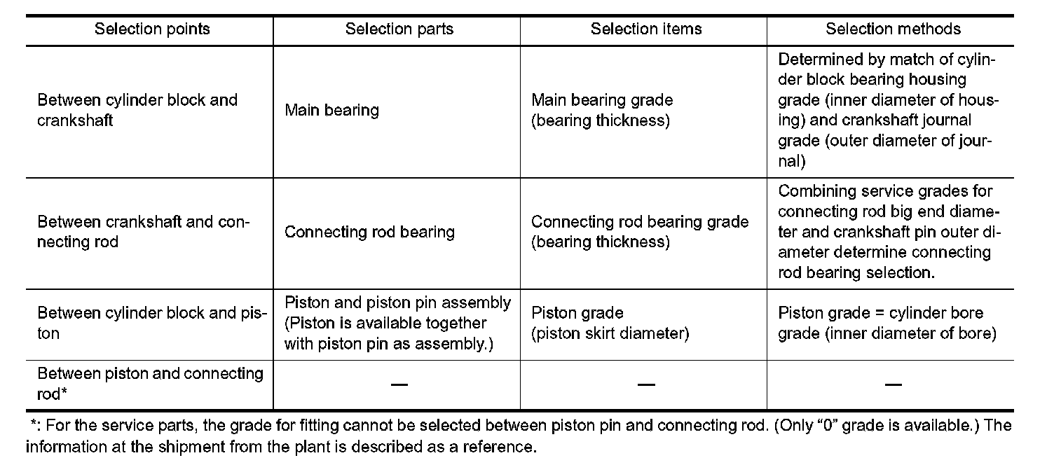 - Piston pin (piston pin hole) grade is provided only for the parts installed at the plant. For service parts, no piston pin grades can be selected. (Only "0" grade is available.)