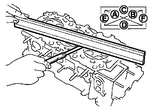 2. At each of several locations on bottom surface of cylinder head, measure the distortion in six directions (A), (B), (C), (D), (E), and (F).