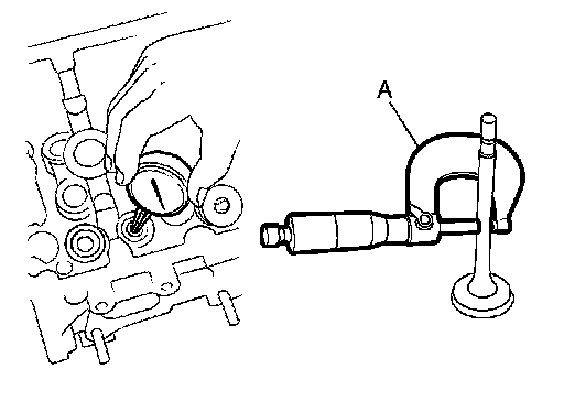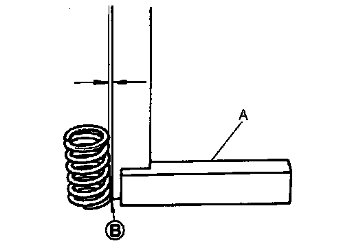 - Set a try square (A) along the side of valve spring and rotate spring. Measure the maximum clearance between the top of spring and try square.