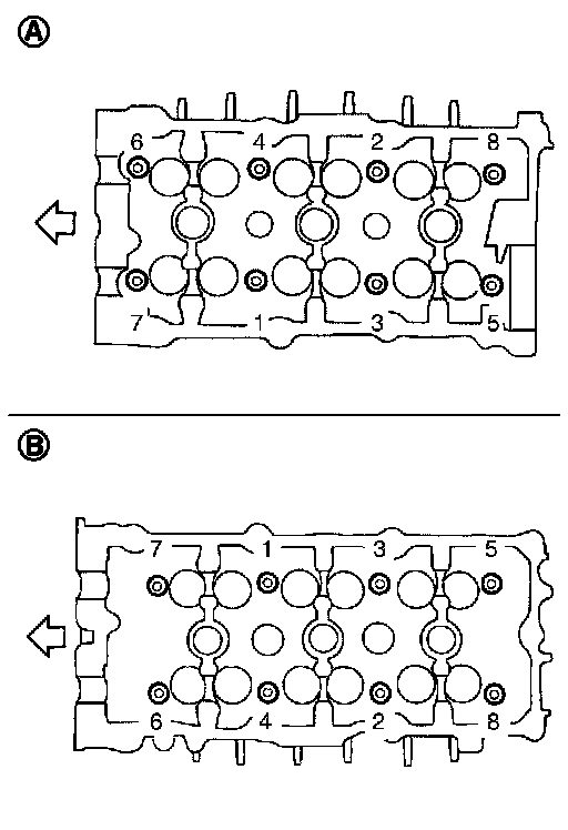 Cylinder head bolts are tightened by plastic zone tightening method. Whenever the size difference between (B) and (A) exceeds the limit, replace them with new one.
