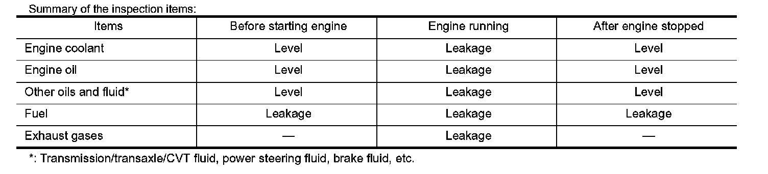 The following are procedures for checking fluids leak, lubricates leak and exhaust gases leak.