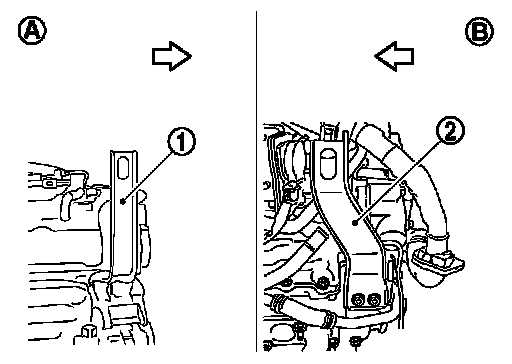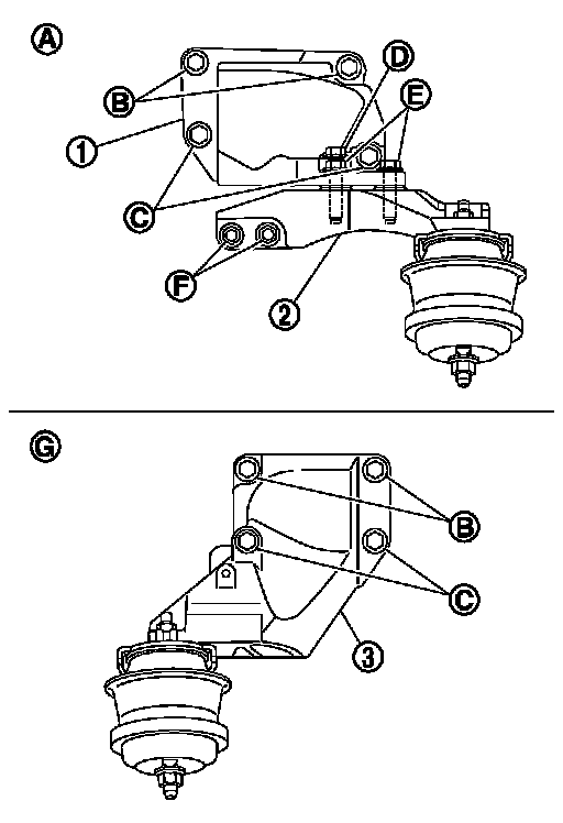 - When installing engine mounting bracket (RH and LH) on cylinder block, tighten two upper bolts [shown as (B) in the figure] first.