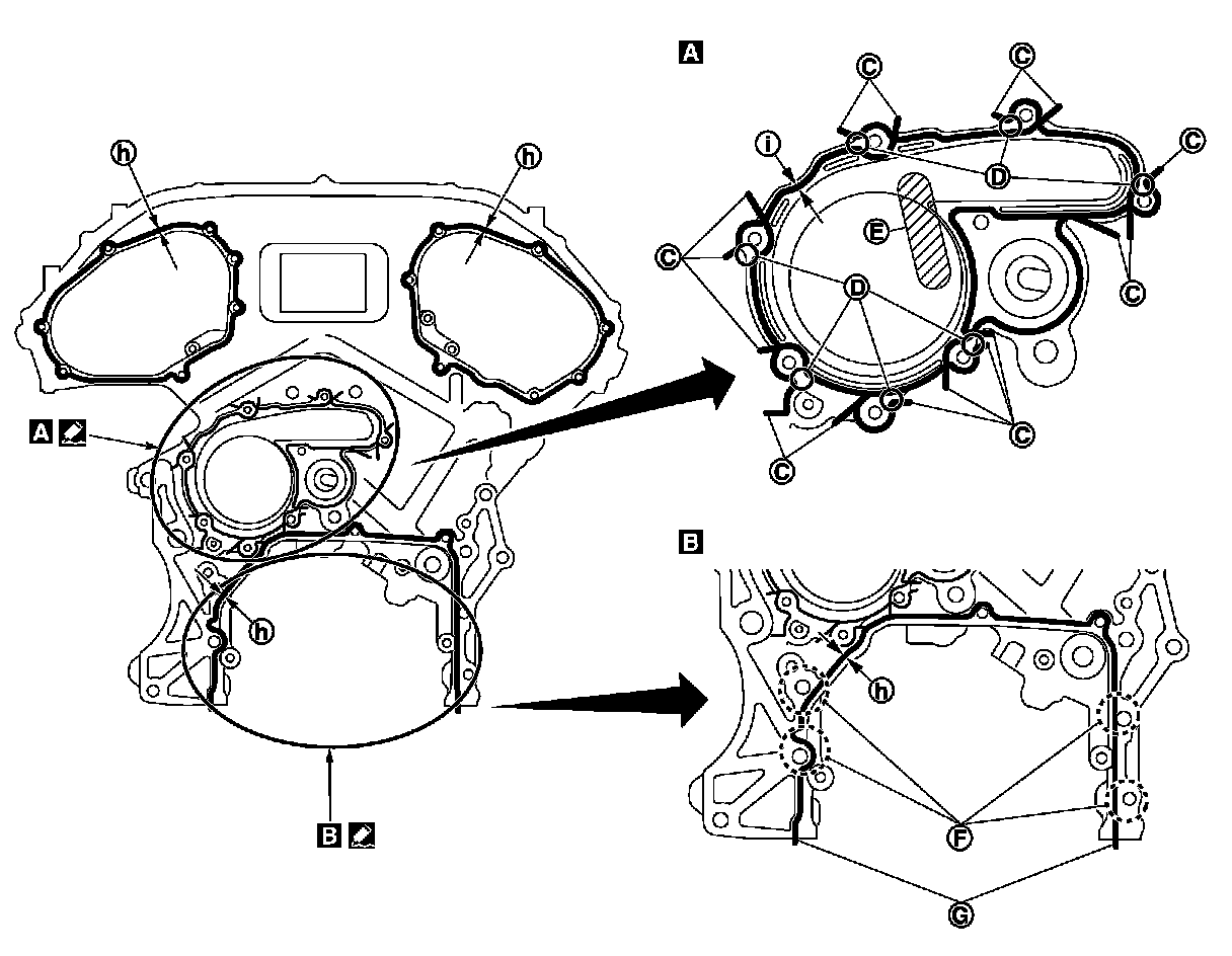 b. Apply liquid gasket with the tube presser (commercial service tool) to rear timing chain case back side as shown in the figure.