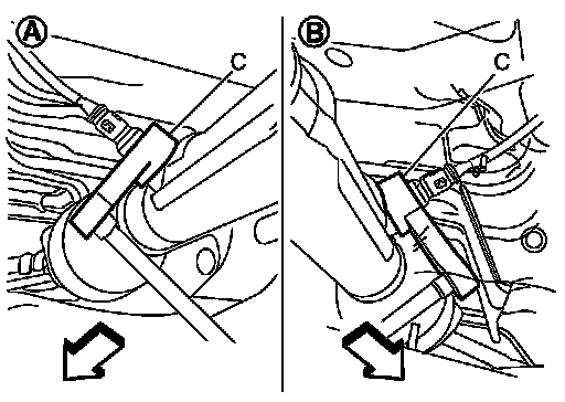 - Using heated oxygen sensor wrench [SST: KV10114400 (J-38365)] (C), remove heated oxygen sensor 2.